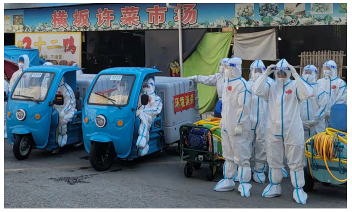 工作队协调陈埭疫情防控环境整治组,到横坂村开展疫情防控消毒消杀行动。此次行动共抽调35名消杀人员,携带中型喷雾车1辆、小型喷雾车2辆、手推式喷雾车2辆、背式喷雾器21个,兵分四组,对照消杀处置规范流程,对村里的道路、菜市场、公厕、垃圾堆放点、臭水沟以及村界等场所,特别对隔离点等重点区域进行不留盲区、不留死角全面消杀。