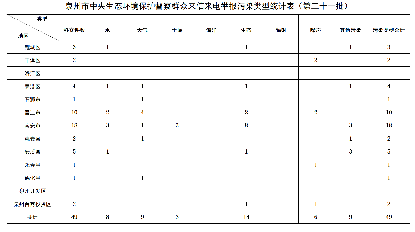 12月23日,中央第一生态环境保护督察组向福建省转办第三十一批群众信访举报件涉及泉州市49件。从生态环境问题类型来看,涉及水8件、大气9件、噪声6件、土壤3件、生态14件、其他污染9件。从区域分布上看,鲤城3件、丰泽2件、泉港4件、石狮1件、晋江10件、南安18件、惠安2件、安溪5件、永春1件、德化1件、泉州台商投资区2件。所有举报件均已及时转交相关县(市、区)或市直部门办理。